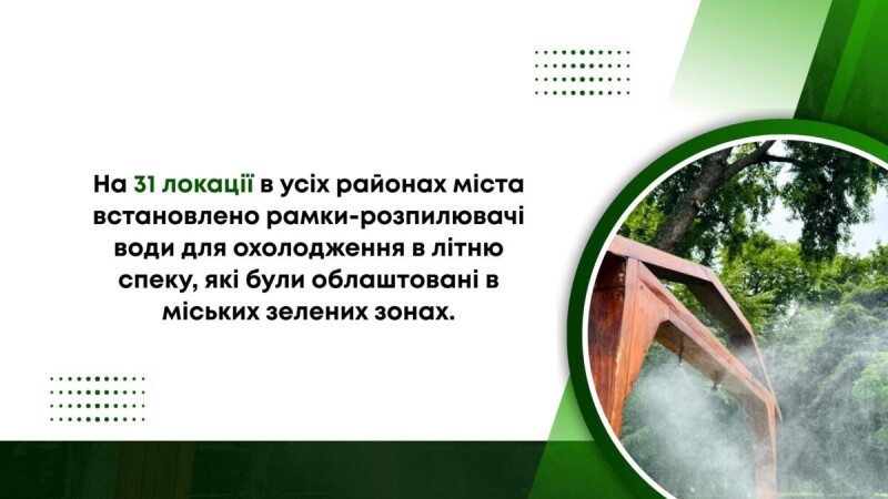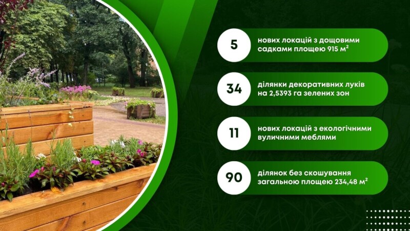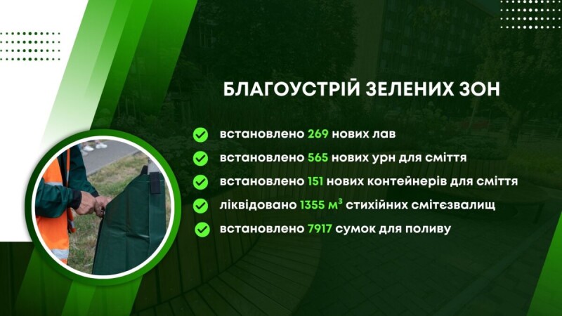 Також в столиці було реалізовано комплекс робіт із благоустрою та озеленення територій, у результаті чого облаштовано 19 нових мініскверів, а для підвищення комфорту перебування мешканців на 11 локаціях встановлено екологічні вуличні меблі загальною площею 157,8 м2.