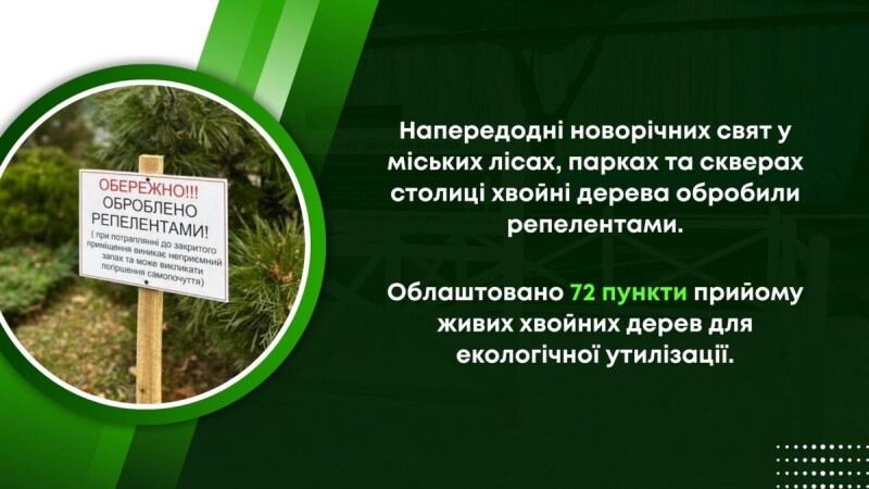 Після завершення свят закликаємо мешканців і гостей Києва передавати живі хвойні дерева на екологічну утилізацію. Для зручності мешканців працюватимуть 72 пункти прийому живих хвойних дерев.