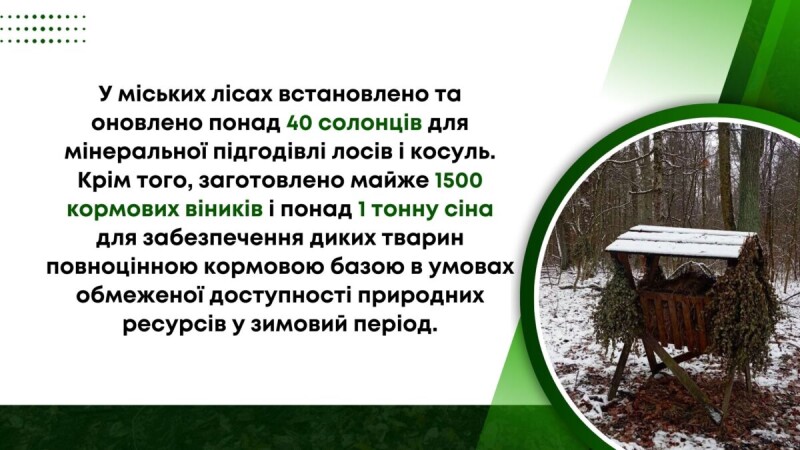 Окрім цього, у лісах столиці встановлено понад 40 солонців для мінеральної підгодівлі лосів і косуль. Така підгодівля є важливою складовою зимового раціону диких тварин і сприяє підтриманню їхнього фізіологічного стану в період підвищених енергетичних витрат.
