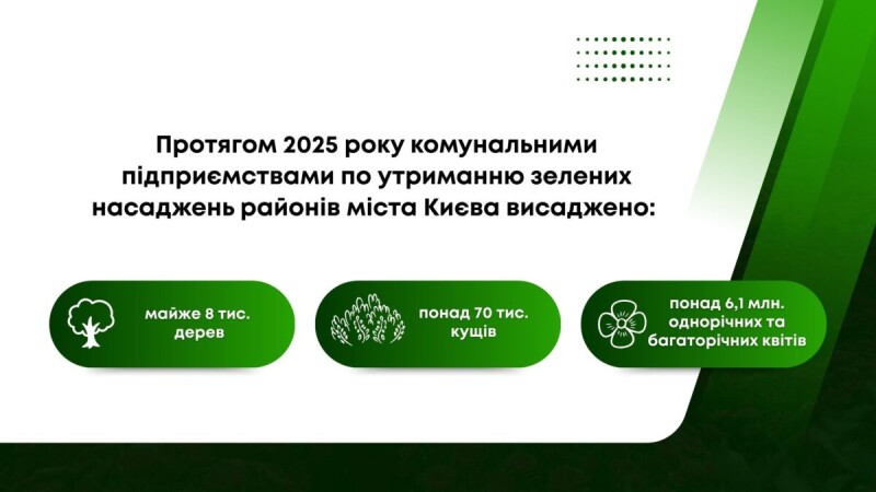 Навіть у складних умовах сьогодення, комунальні підприємства, що входять до складу КО «Київзеленбуд», продовжують працювати над озелененням столиці. За підсумками 2025 року в парках, скверах та на бульварах столиці висаджено майже 8 тис. дерев, понад 70 тис. кущів і більш як 6,1 млн квітів.