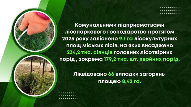 Окрему увагу приділено розвитку міських лісів, лісопарковими господарствами заліснено 9,1 га лісокультурних площ, на яких висаджено 234,2 тис. сіянців головних лісотвірних порід, зокрема 179,2 тис. хвойних порід.