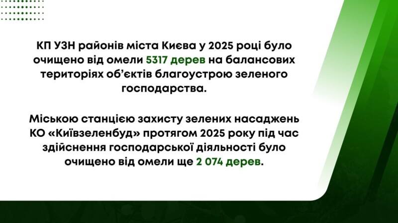 Крім того, міською станцією захисту зелених насаджень КО «Київзеленбуд» протягом 2025 року під час здійснення господарської діяльності було очищено від омели ще 2074 дерев.